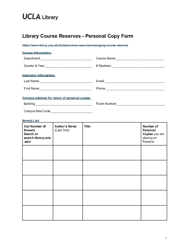 Library Course Reserves Personal Copy Form https://www.library.ucla.edu/help/servicesresources/managingcoursereservesCourse Information: Department:___Course Name:___Quarter & Year:___# Students:___Instructor