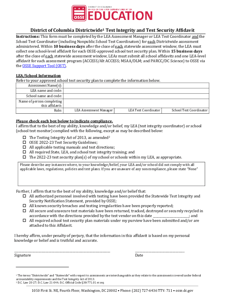 District of Columbia District wide 1 Test Integrity and Test Security Affidavit Instructions: This form must be completed by the LEA Assessment Manager or LEA Test Coordinator and the School Test