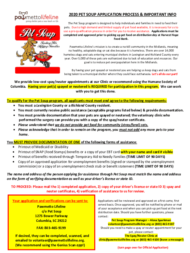 2020 PET SOUP APPLICATION PROCESS & IMPORTANT INFO The Pet Soup program is designed to help individuals and families in need to feed their pets. Due to high demand and limited supply of pet food available,