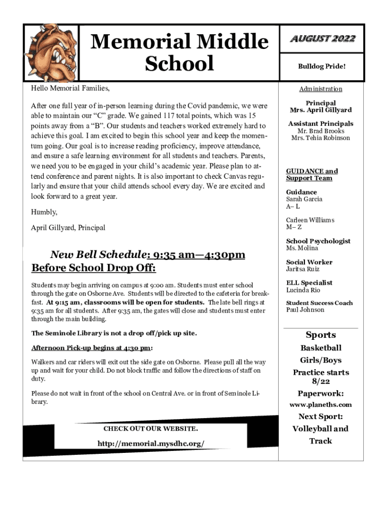Memorial Middle School Hello Memorial Families, After one full year of unperson learning during the COVID-19 pandemic, we were able to maintain our C grade. We gained 117 total points, which was 15