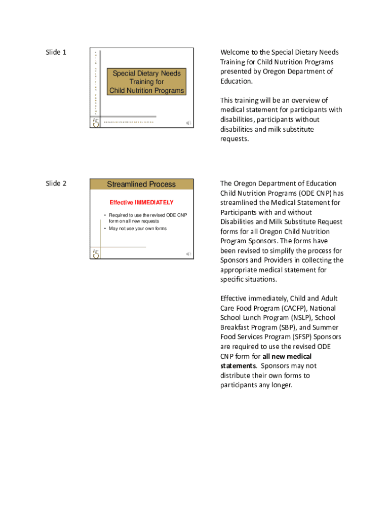 Slide 1C H I L D N U T R I T I ON Special Dietary Needs Training for Child Nutrition Programs R O G R A MS OREGON DEPARTMENT OF Educationalist 2Streamlined Process Effective IMMEDIATELY Required to