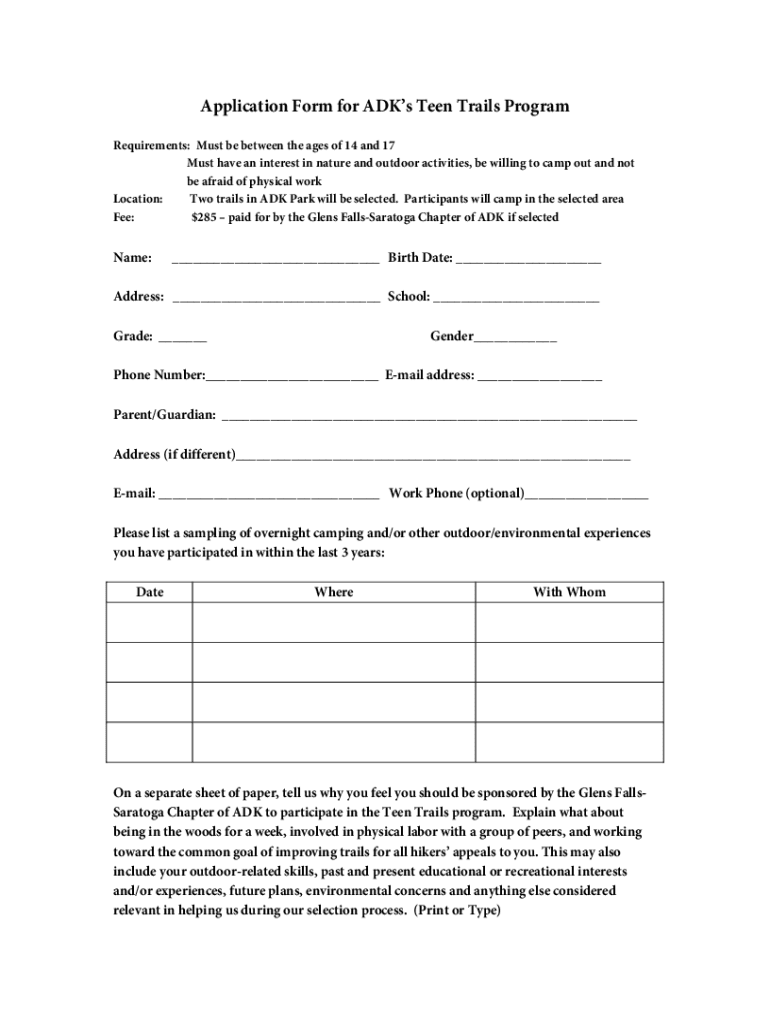 Must have an interest in nature and outdoor activities, be willing to camp out and not