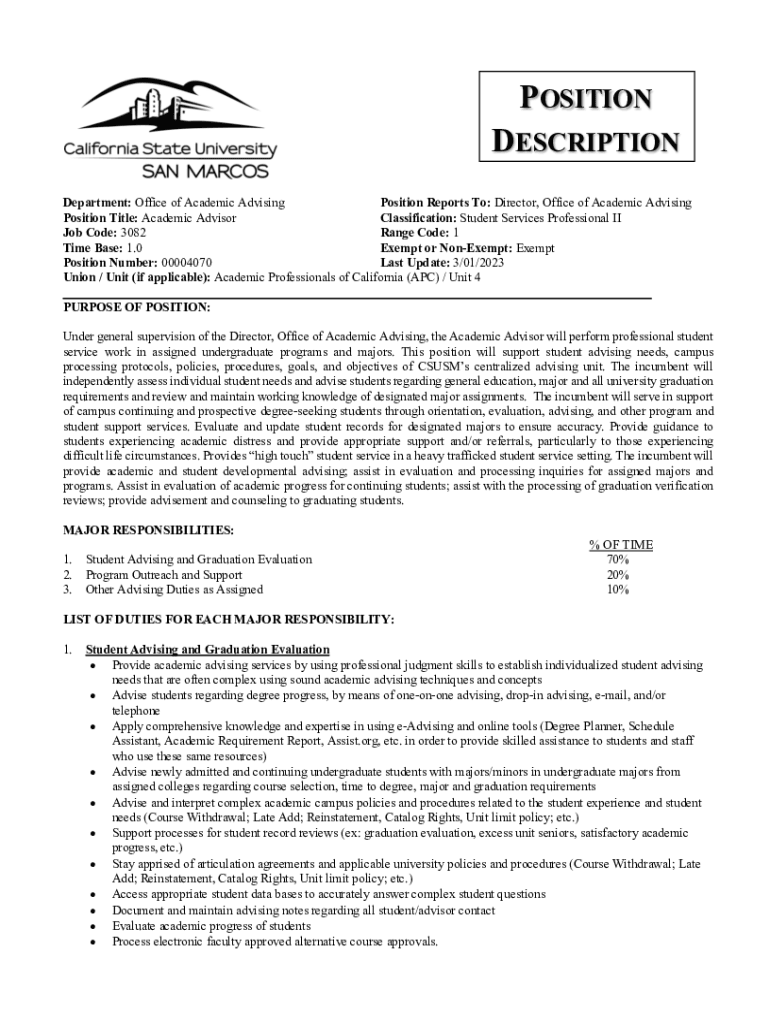 POSITION DESCRIPTION Department: Office of Academic Advising Position Reports To: Director, Office of Academic Advising Position Title: Academic Advisor Classification: Student Services Professional