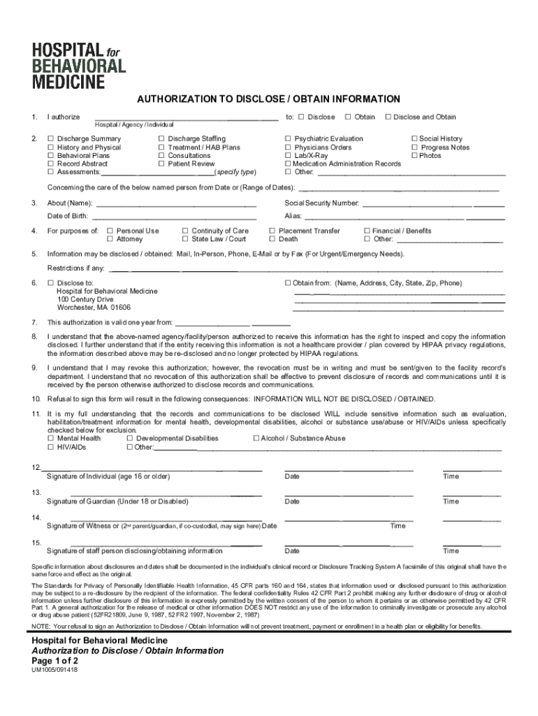 AUTHORIZATION TO DISCLOSE / OBTAIN INFORMATION 1. I authorize2. ____Hospital / Agency / IndividualDischarge Summary History and Physical Behavioral Plans Record Abstract Assessments:_ to: DiscloseDischarge