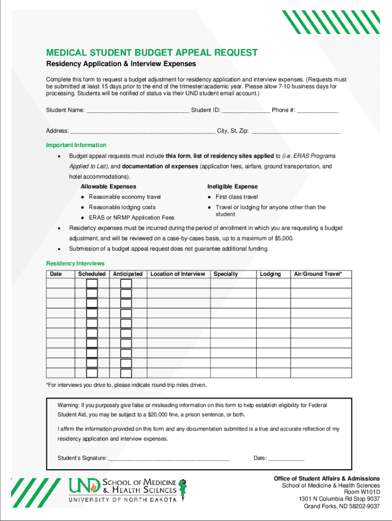 MEDICAL STUDENT BUDGET APPEAL REQUEST Residency Application & Interview Expenses Complete this form to request a budget adjustment for residency application and interview expenses. (Requests must