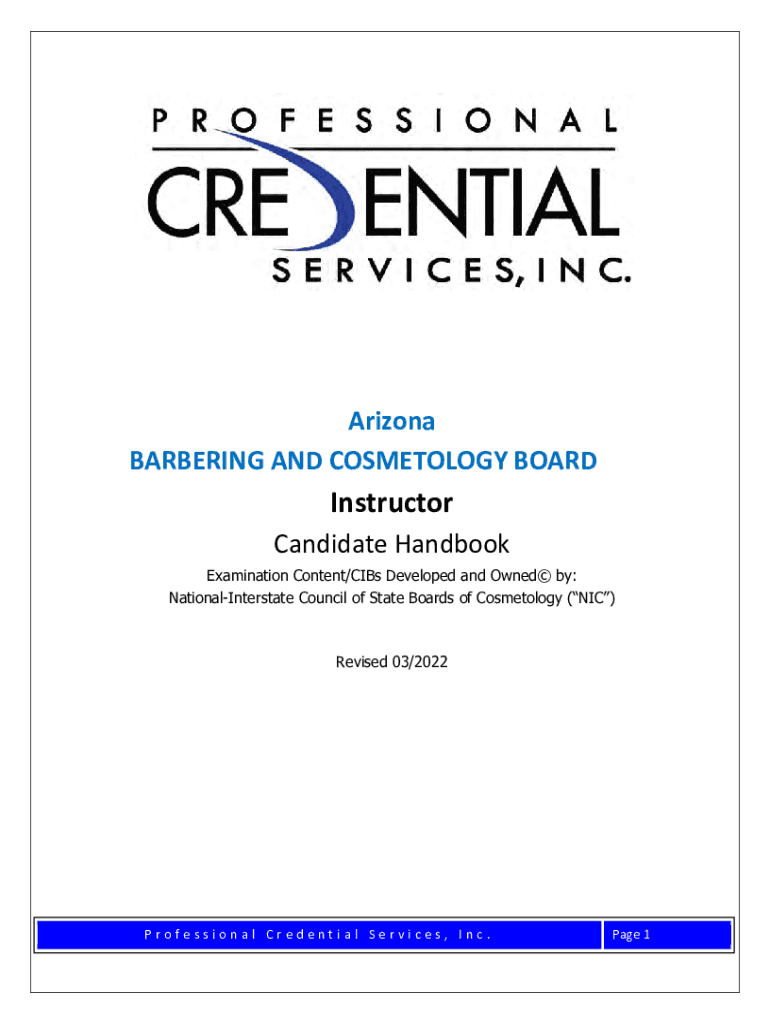 Arizona BARBERING AND COSMETOLOGY BOARDInstructor Candidate Handbook Examination Content/Ribs Developed and Owned by: NationalInterstate Council of State Boards of Cosmetology (NIC)Revised 03/2022Professional