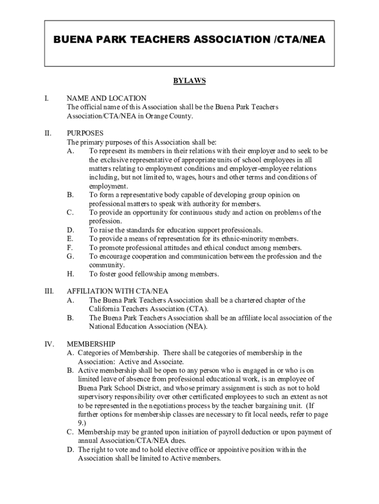 BUENA PARK TEACHERS ASSOCIATION /CTA/BYLAWS I.NAME AND LOCATION The official name of this Association shall be the Buena Park Teachers Association/CTA/NEA in Orange County.II.PURPOSES The primary