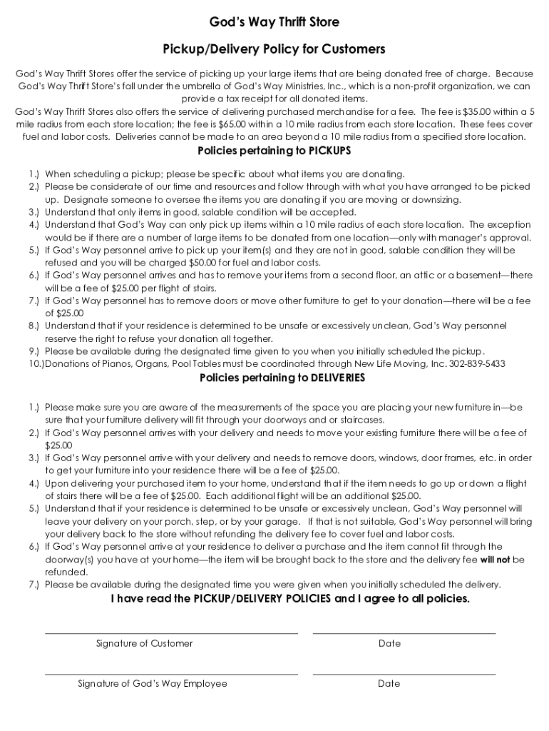 Gods Way Thrift Store Pickup/Delivery Policy for Customers Gods Way Thrift Stores offer the service of picking up your large items that are being donated free of charge. Because Gods Way Thrift Stores