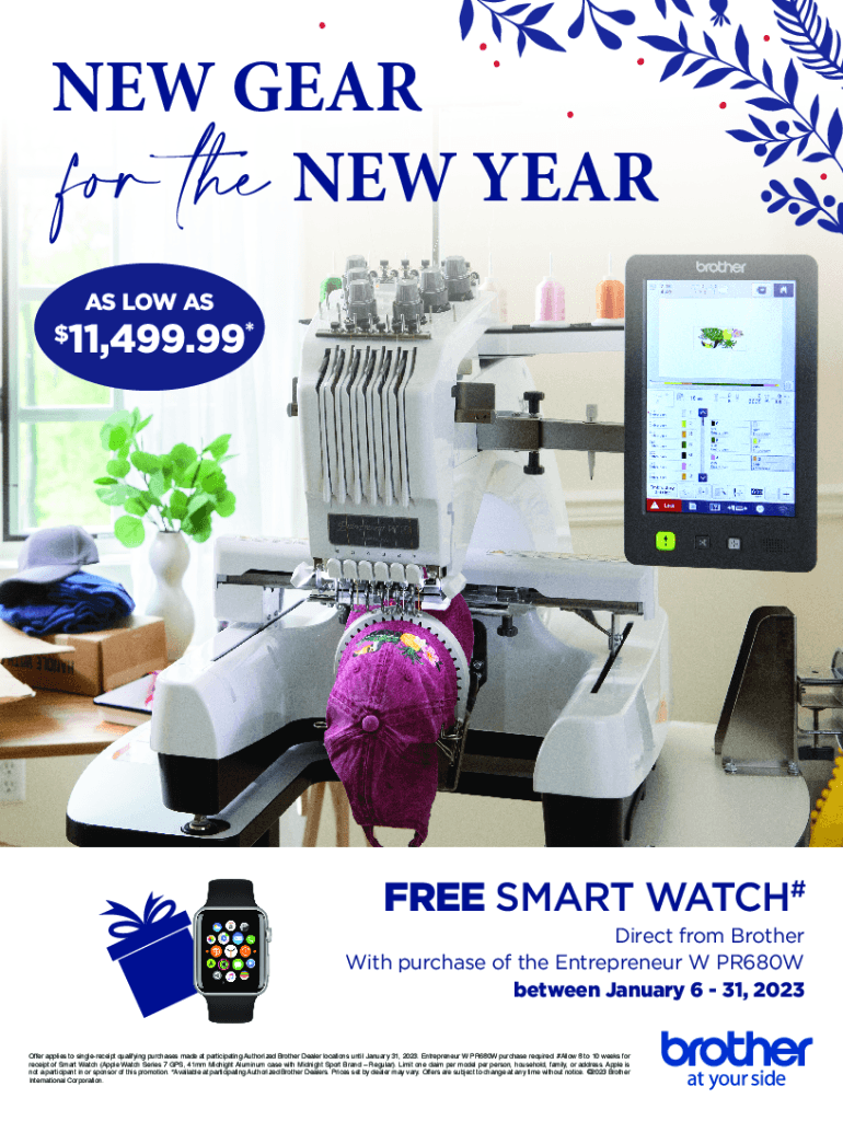 NEW GEAR for the NEW YEAR AS LOW AS11,499.99*$FREE Smartwatch# Direct from Brother With purchase of the Entrepreneur W PR680W between January 6 31, 2023 Offer applies to single receipt qualifying