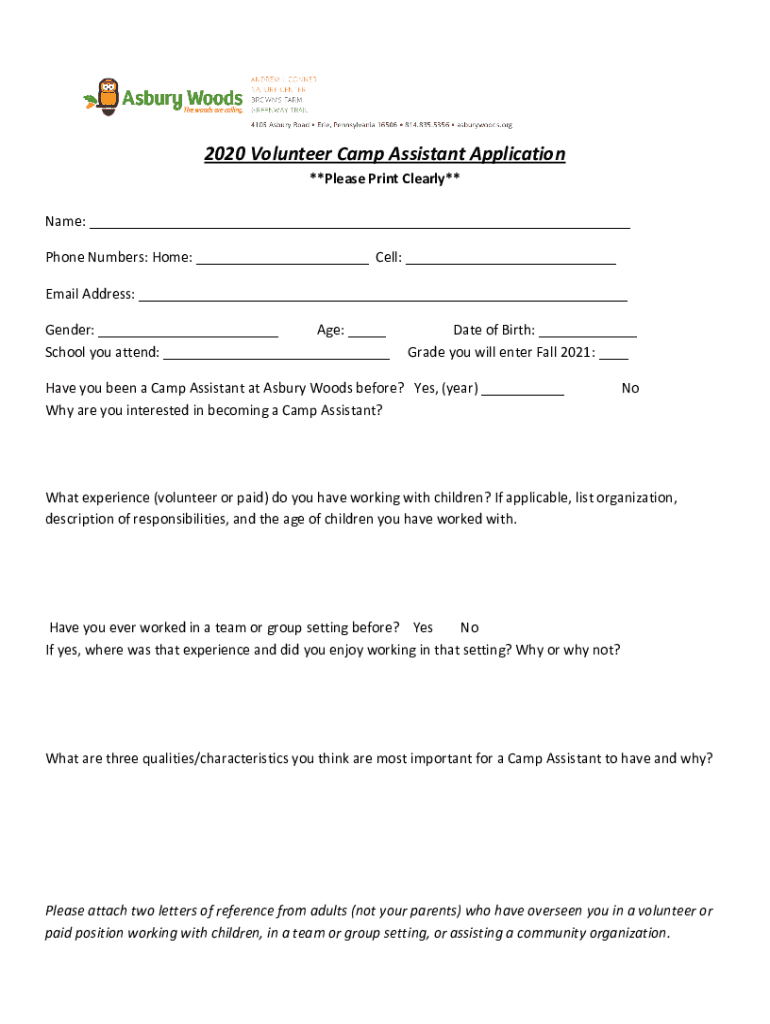 2020 Volunteer Camp Assistant Application **Please Print Clearly** Name: ___ Phone Numbers: Home: ___ Cell: ___ Email Address: ___ Gender: ___ Age: ___ School you attend: ___Date of Birth: ___ Grade