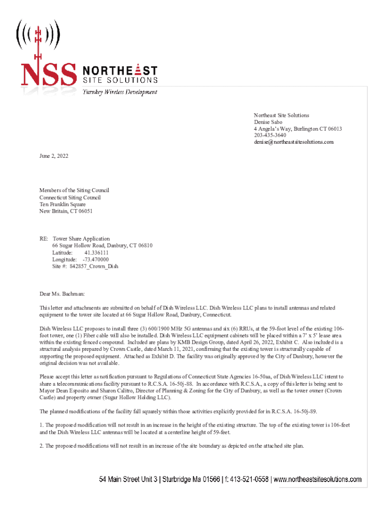 Northeast Site Solutions Denise Sago 4 Angela's Way, Burlington CT 06013 2034353640 denise@northeastsitesolutions.com June 2, 2022Members of the Siting Council Connecticut Siting Council Ten Franklin