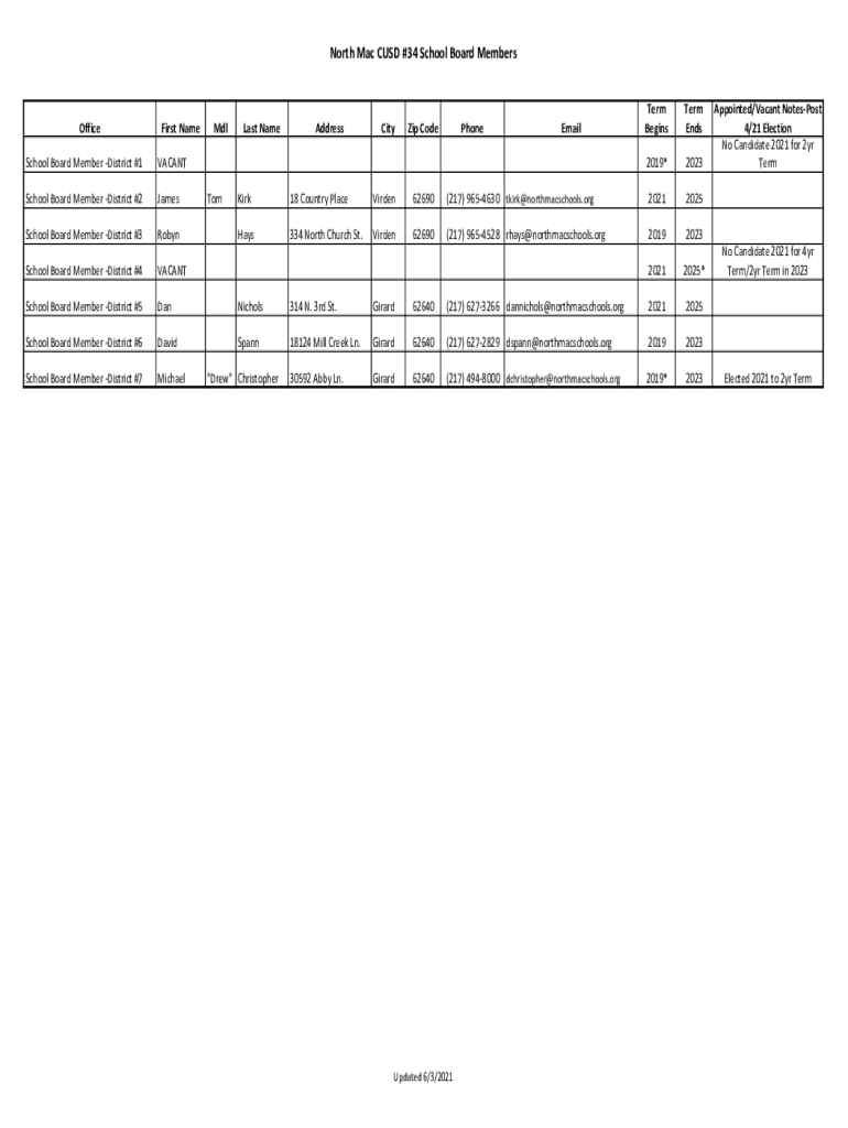 North Mac CUSP #34 School Board MembersOfficeFirst NameMdlLast NameAddressCityZip Homeschool Board Member District #1VACANTSchool Board Member District #2JamesSchool Board Member District #3RobynSchool