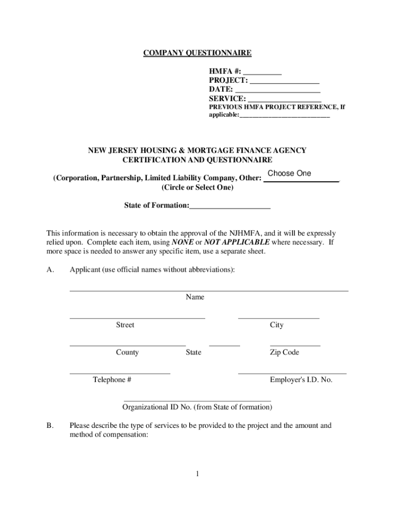 COMPANY QUESTIONNAIRE MFA #: ___ PROJECT: ___ DATE: ___ SERVICE: ___ PREVIOUS MFA PROJECT REFERENCE, If applicable:___NEW JERSEY HOUSING & MORTGAGE FINANCE AGENCY CERTIFICATION AND QUESTIONNAIRE (Corporation,