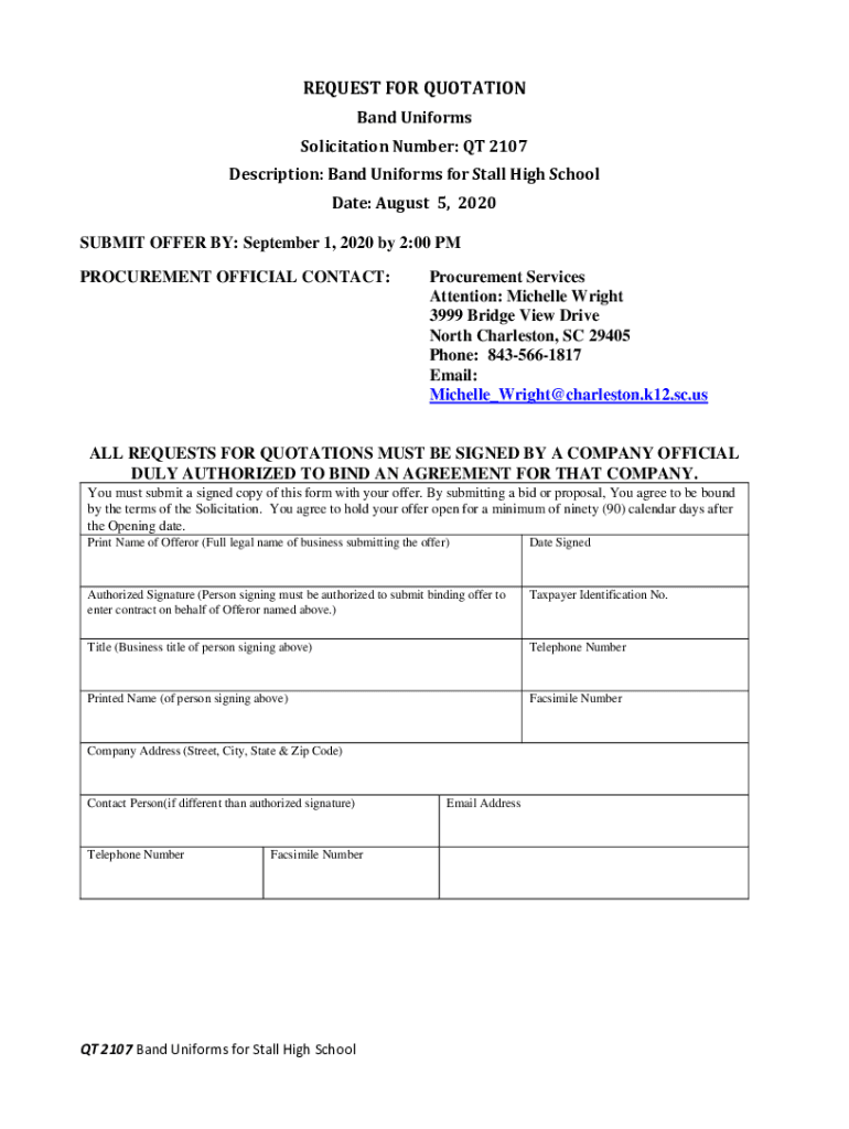 REQUEST FOR QUOTATION Band Uniforms Solicitation Number: QT 2107 Description: Band Uniforms for Stall High School Date: August 5, 2020, SUBMIT OFFER BY: September 1, 2020, by 2:00 PM PROCUREMENT OFFICIAL