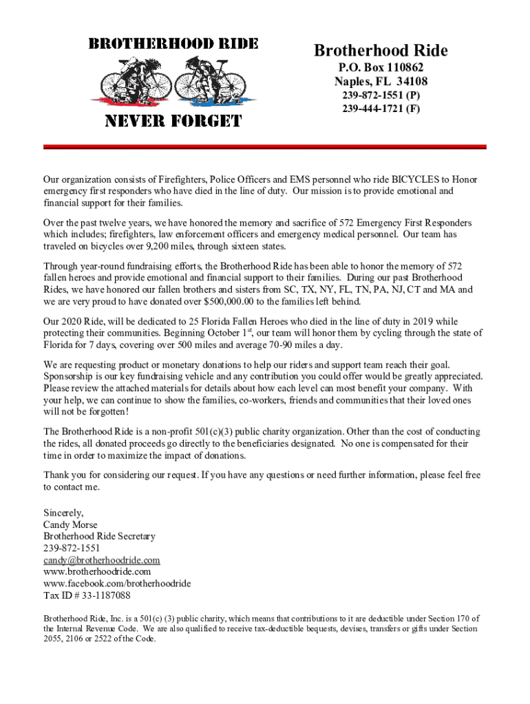 Brotherhood Ride P.O. Box 110862 Naples, FL 34108 2398721551 (P) 2394441721 (F)Our organization consists of Firefighters, Police Officers and EMS personnel who ride BICYCLES to Honor emergency first