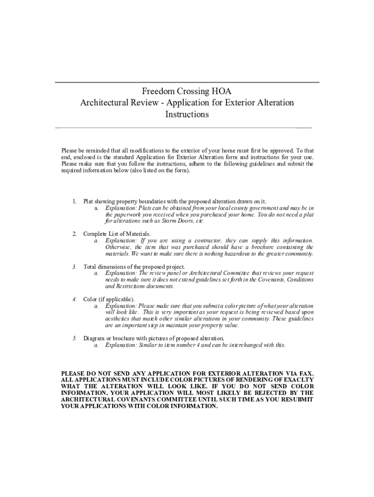 Freedom Crossing HOA Architectural Review Application for Exterior Alteration InstructionsPlease be reminded that all modifications to the exterior of your home must first be approved. To that end,