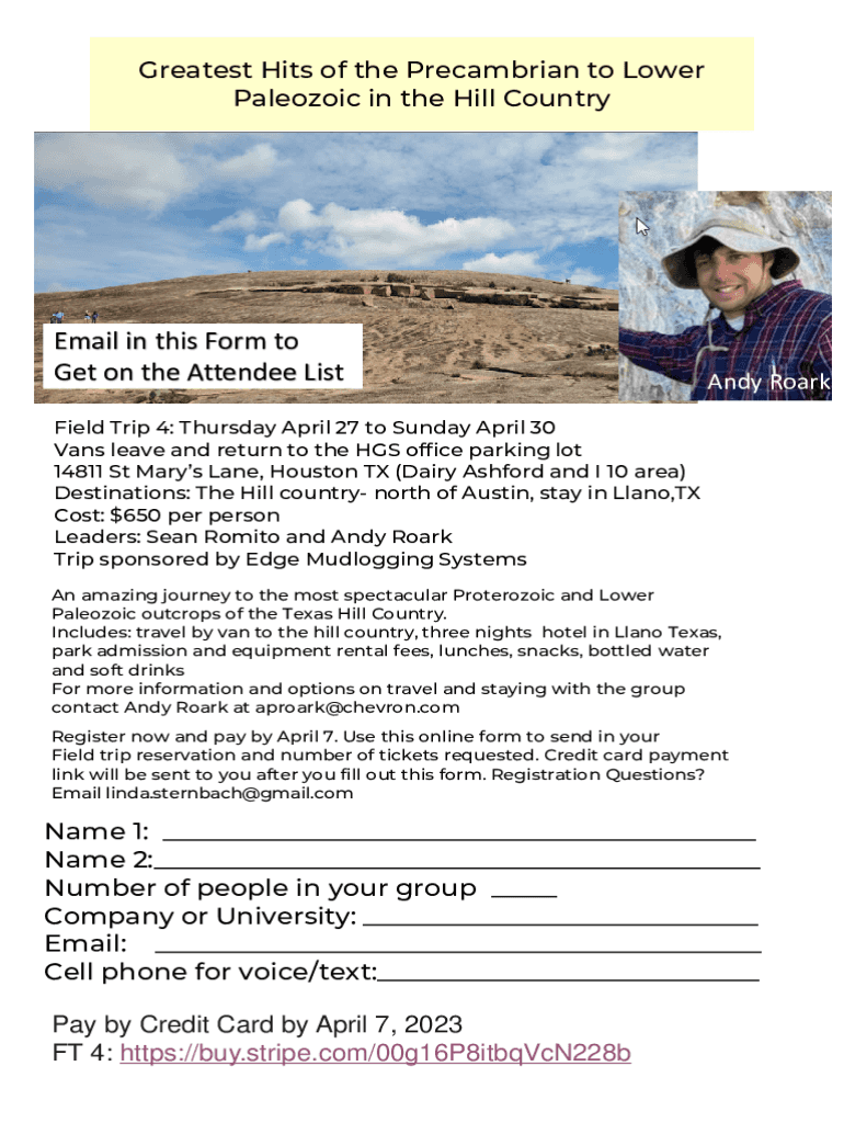 The Greatest Hits of the Precambrian to Lower Paleozoic in the Hill Countryman in this Form to Get on the Attendee List Andy Garfield Trip 4: Thursday, April 27 to Sunday, April 30 Vans leave and