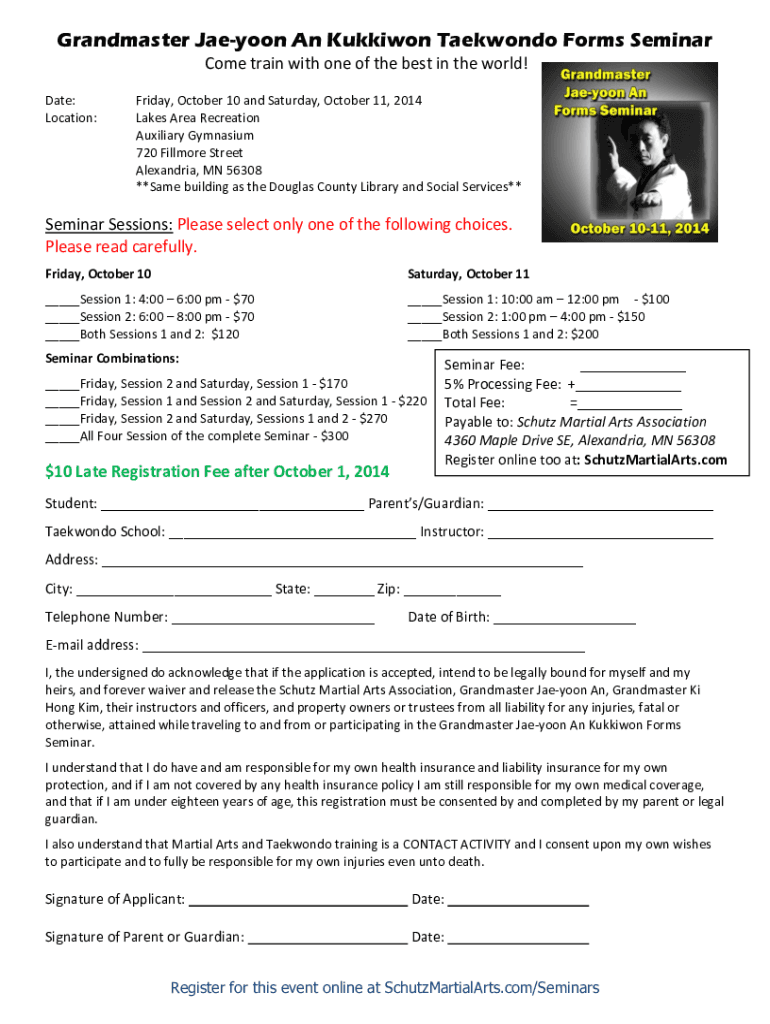 Grand master Jean An Kukkiwon Taekwondo Forms Seminar Come train with one of the best in the world! Date: Location:Friday, October 10 and Saturday, October 11, 2014, Lakes Area Recreation Auxiliary