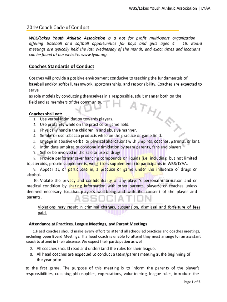 WBS/LakesYouthAthleticAssociation|LYAA2019 Coach Code of Conduct WBS/Lakes Youth Athletic Association is a not for profit multisport organization offering baseball and softball opportunities for boys