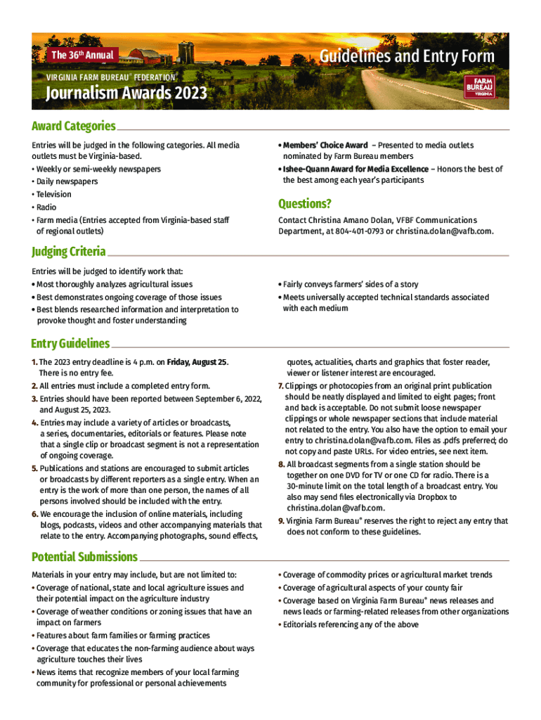 The 36th AnnualGuidelines and Entry FormVIRGINIA FARM BUREAU FEDERATIONJournalism Awards 2023 Award Categories Entries will be judged in the following categories. All media outlets must be Virginia