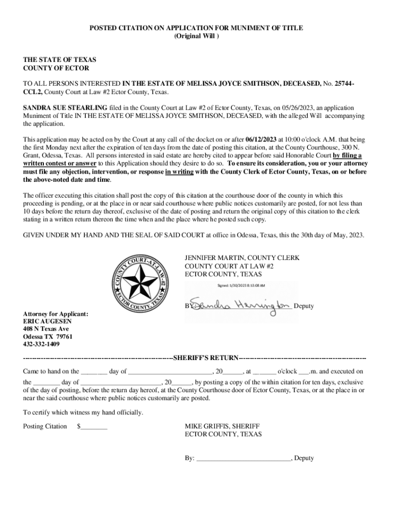 POSTED CITATION ON APPLICATION FOR MONUMENT OF TITLE (Original Will)THE STATE OF TEXAS COUNTY OF ACTOR TO ALL PERSONS INTERESTED IN THE ESTATE OF MELISSA JOYCE SMITHSON, DECEASED, No. 25744CCL2, County