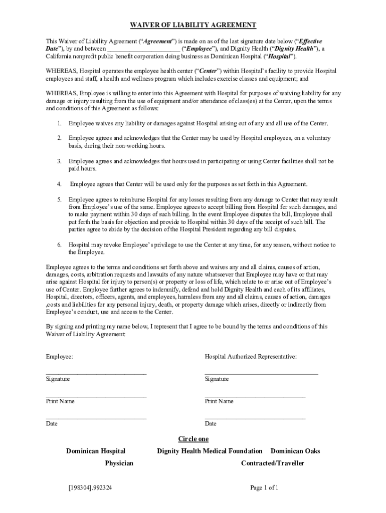 WAIVER OF LIABILITY AGREEMENT This Waiver of Liability Agreement (Agreement) is made on as of the last signature date below (Effective Date), by and between ___ (Employee), and Dignity Health (Dignity