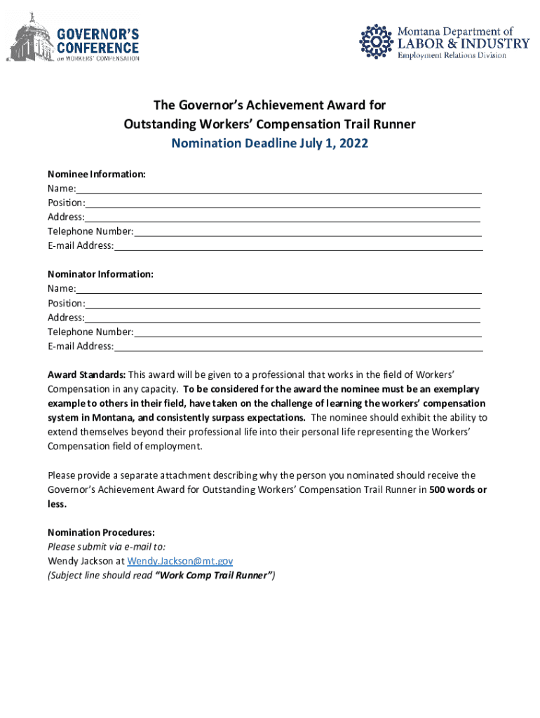 The Governors Achievement Award for Outstanding Workers Compensation Trail Runner Nomination Deadline July 1, 2022, Nominee Information: Name:___ Position:___ Address:___ Telephone Number:___ Email