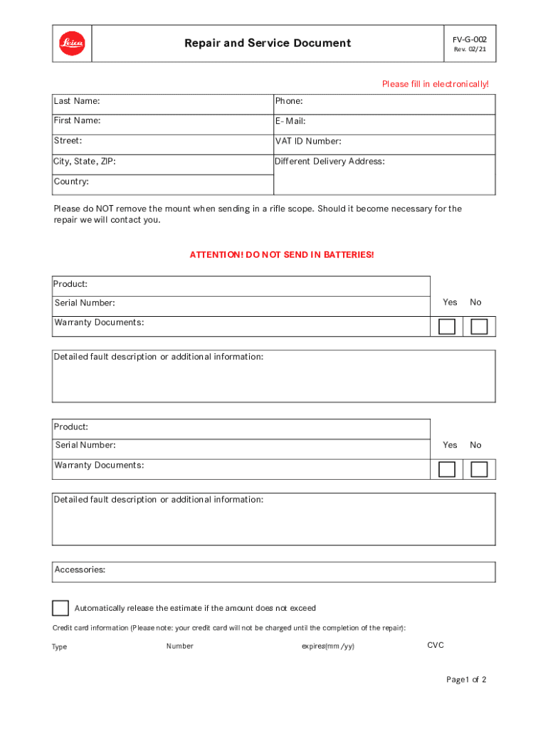 FVG002Repair and Service Document Rev. 02/21Please fill in electronically! Last Name:Phone:First Name:E Mail:Street:VAT ID Number:City, State, ZIP:Different Delivery Address:Country: Please do NOT