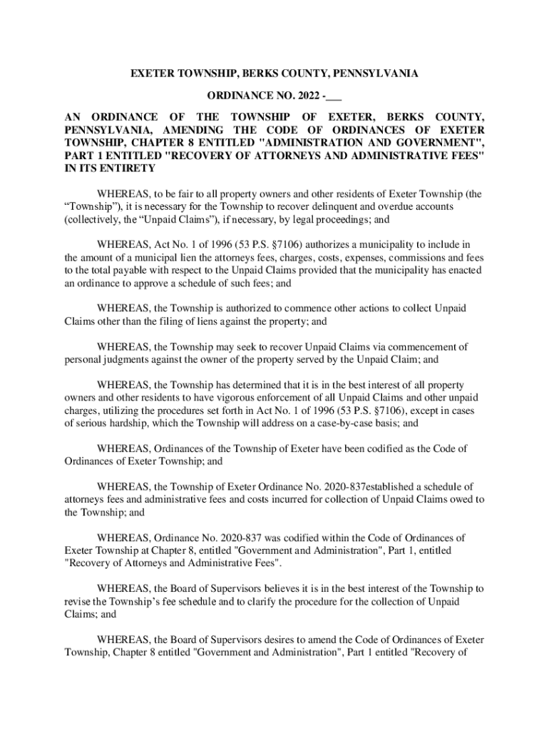 EXE TER TOWNSHIP, BERKS COUNTY, PENNSYLVANIA ORDINANCE NO. 2022 ___ AN ORDINANCE OF THE TOWNSHIP OF EXE TER, BERKS COUNTY, PENNSYLVANIA, AMENDING THE CODE OF ORDINANCES OF EXE TER TOWNSHIP, CHAPTER
