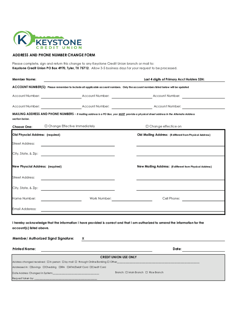 ADDRESS AND PHONE NUMBER CHANGE FORM Please complete, sign and return this change to any Keystone Credit Union branch or mail to: Keystone Credit Union PO Box 4970, Tyler, TX 75712. Allow 35 business