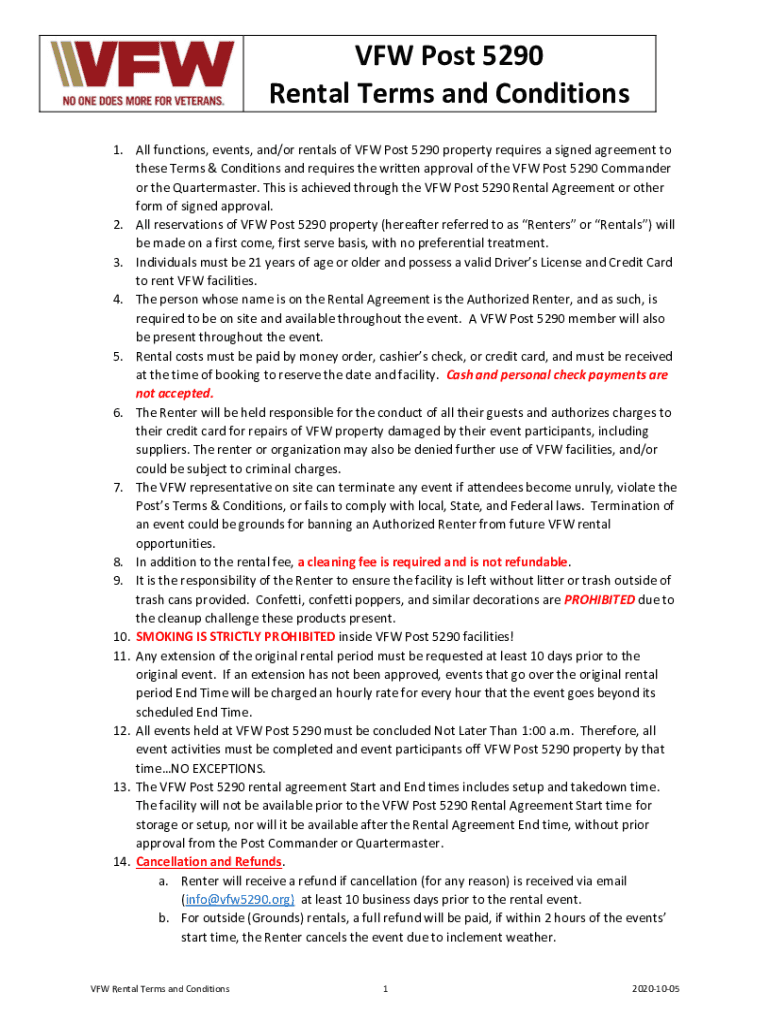 VFW Post 5290 Rental Terms and Conditions 1. All functions, events, and/or rentals of VFW Post 5290 property requires a signed agreement to these Terms & Conditions and requires the written approval