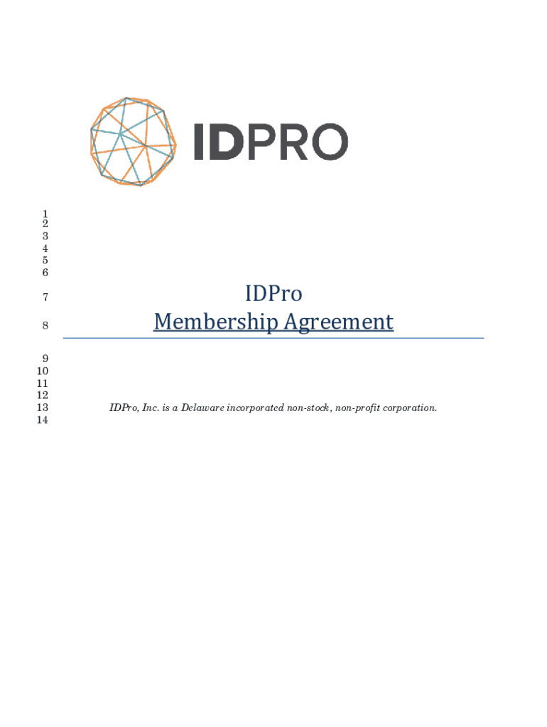 1 2 3 4 5 6 7 8 9 10 11 12 13 14IDPro Membership AgreementIDPro, Inc. is a Delaware incorporated nonstick, nonprofit corporation.IDPro15 16 17 18 19 20 21 22 23 24 25 26 27 28 29 30 31 32 33 34 35