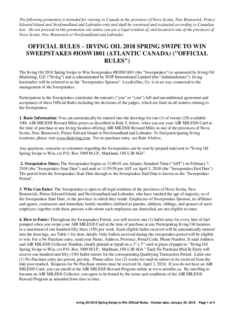 The following promotion is intended for viewing in Canada in the provinces of Nova Scotia, New Brunswick, Prince Edward Island and Newfoundland and Labrador only and shall be construed and evaluated