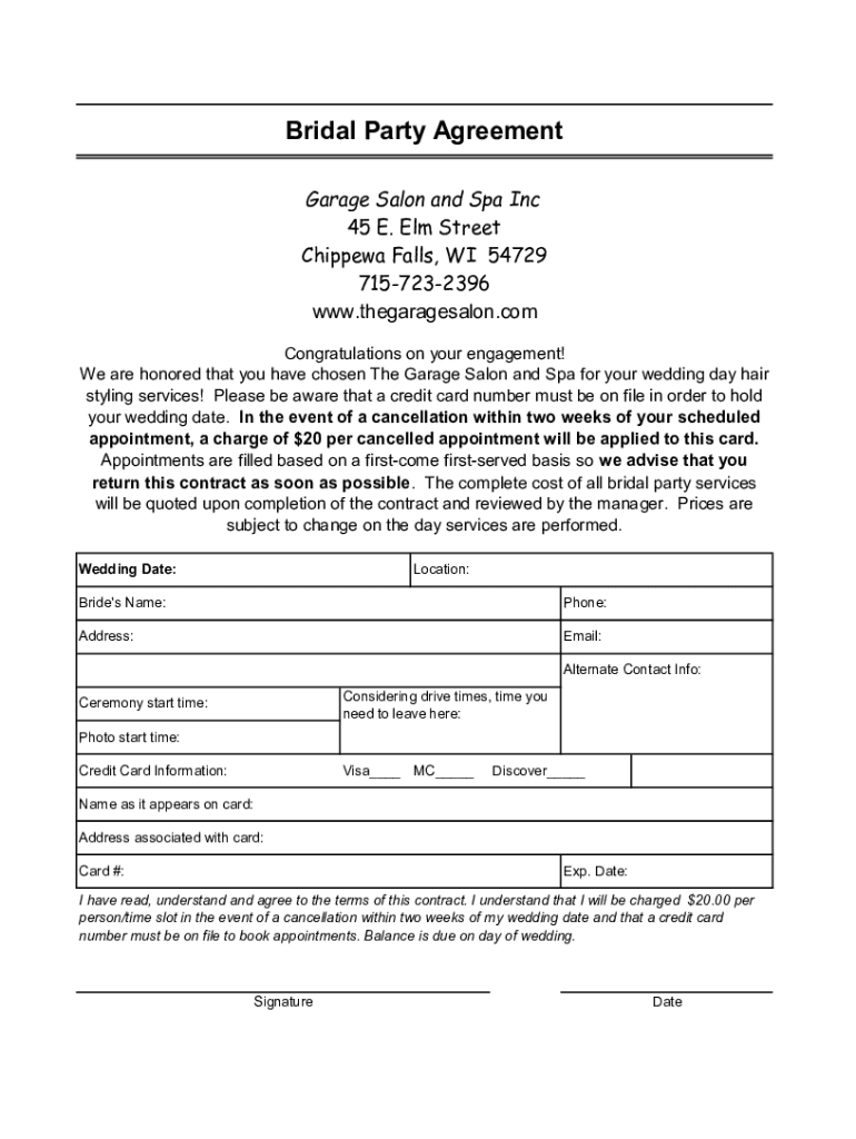 Bridal Party Agreement Garage Salon and Spa Inc 45 E. Elm Street Chippewa Falls, WI 54729 7157232396 www.thegaragesalon.com Congratulations on your engagement! We are honored that you have chosen
