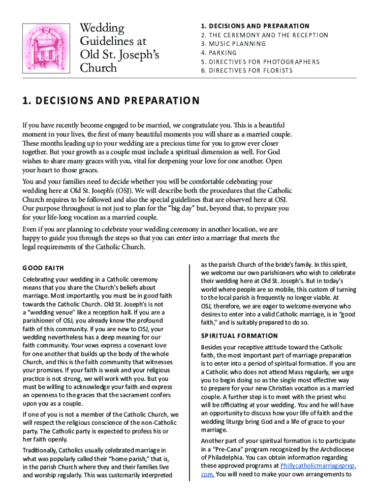Wedding Guidelines at Old St. Josephs Church1. 2. 3. 4. 5. 6.DECISIONS AND PREPARATION THE CEREMONY AND THE RECEPTION MUSIC PLANNING PARKING DIRECTIVES FOR PHOTOGRAPHERS DIRECTIVES FOR FLORISTS1.