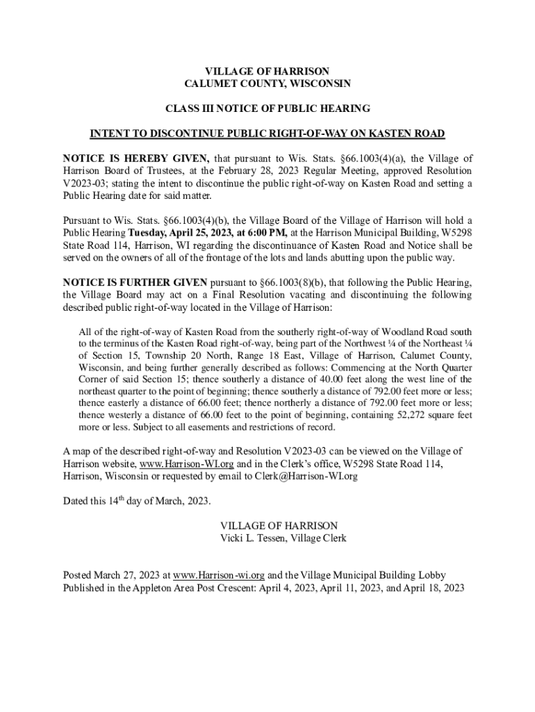 VILLAGE OF HARRISON CALUMET COUNTY, WISCONSIN CLASS III NOTICE OF PUBLIC HEARING INTENT TO DISCONTINUE PUBLIC RIGHTOFWAY ON FASTEN ROAD NOTICE IS HEREBY GIVEN, that pursuant to Wis. Stats. 66.1003(4)(a),