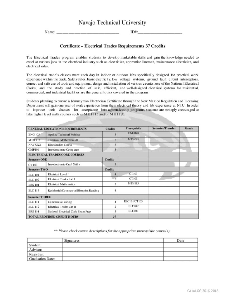 Navajo Technical University Name: ___ID#:___Certificate Electrical Trades Requirements 37 Credits The Electrical Trades program enables students to develop marketable skills and gain the knowledge