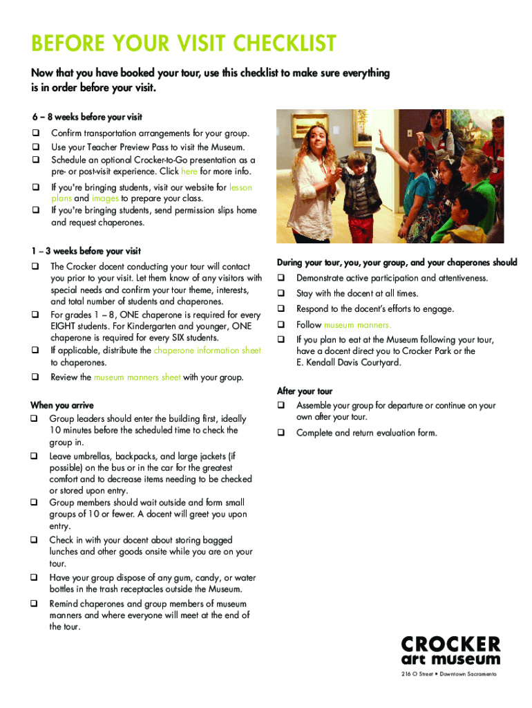 BEFORE YOUR VISIT CHECKLIST Now that you have booked your tour, use this checklist to make sure everything is in order before your visit. 6 8 weeks before your visit Confirm transportation arrangements
