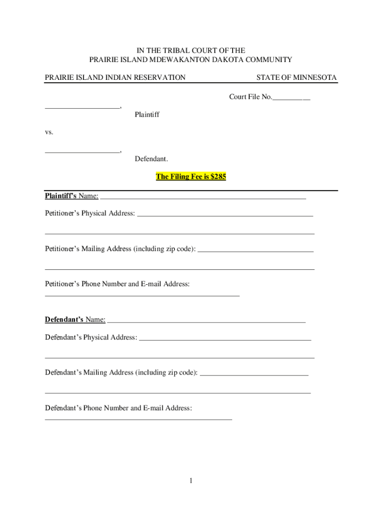 IN THE TRIBAL COURT OF THE PRAIRIE ISLAND MDEWAKANTON DAKOTA COMMUNITY PRAIRIE ISLAND INDIAN RESERVATIONSTATE OF MINNESOTA Court File No.______, Plaintiff vs. ___, Defendant. The Filing Fee is $285