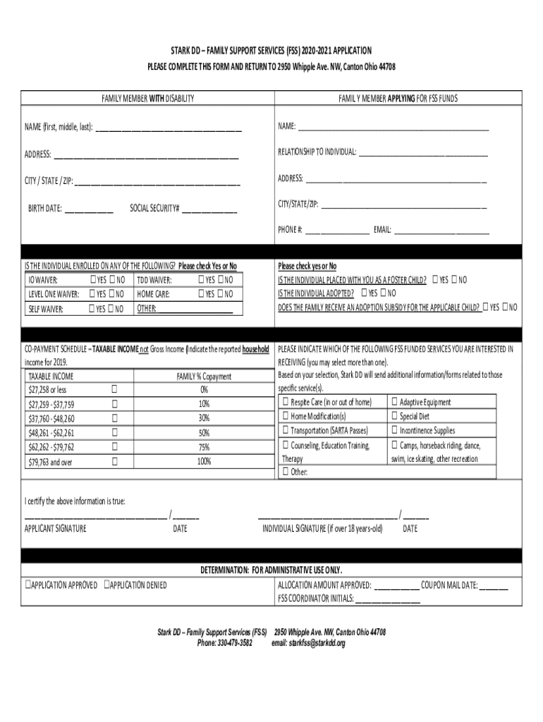 STARK DD FAMILY SUPPORT SERVICES (FSS) 20202021 APPLICATION PLEASE COMPLETE THIS FORM AND RETURN TO 2950 Whipple Ave. NW, Canton Ohio 44708 FAMILY MEMBER WITH DISABILITYFAMIL Y MEMBER APPLYING FOR