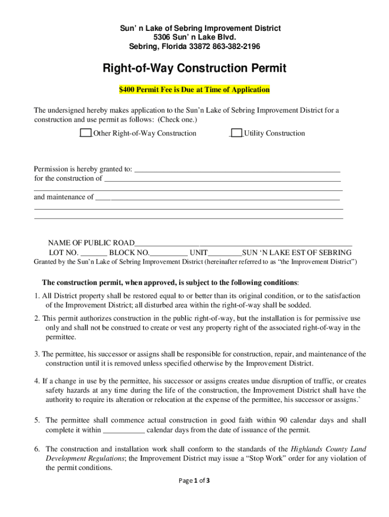 Sun n Lake of Sebring Improvement District 5306 Sun n Lake Blvd. Sebring, Florida 33872 8633822196RightofWay Construction Permit $400 Permit Fee is Due at Time of Application The undersigned hereby