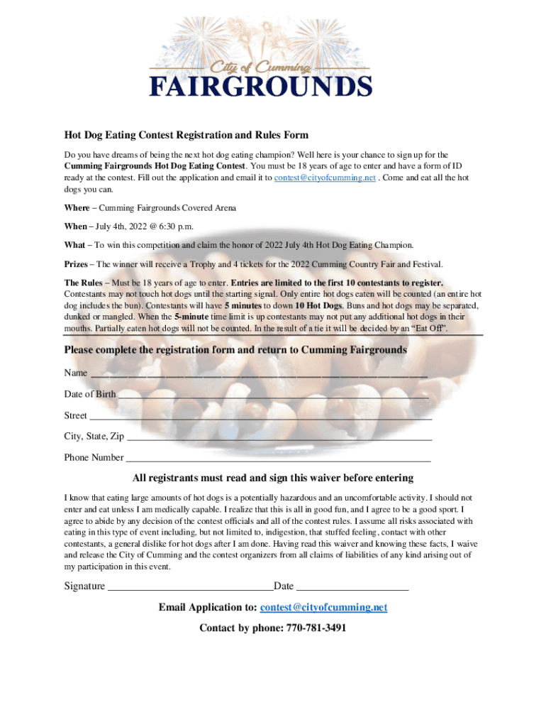 Hot Dog Eating Contest Registration and Rules Form Do you have dreams of being the next hot dog eating champion? Well here is your chance to sign up for the Cumming Fairgrounds Hot Dog Eating Contest.