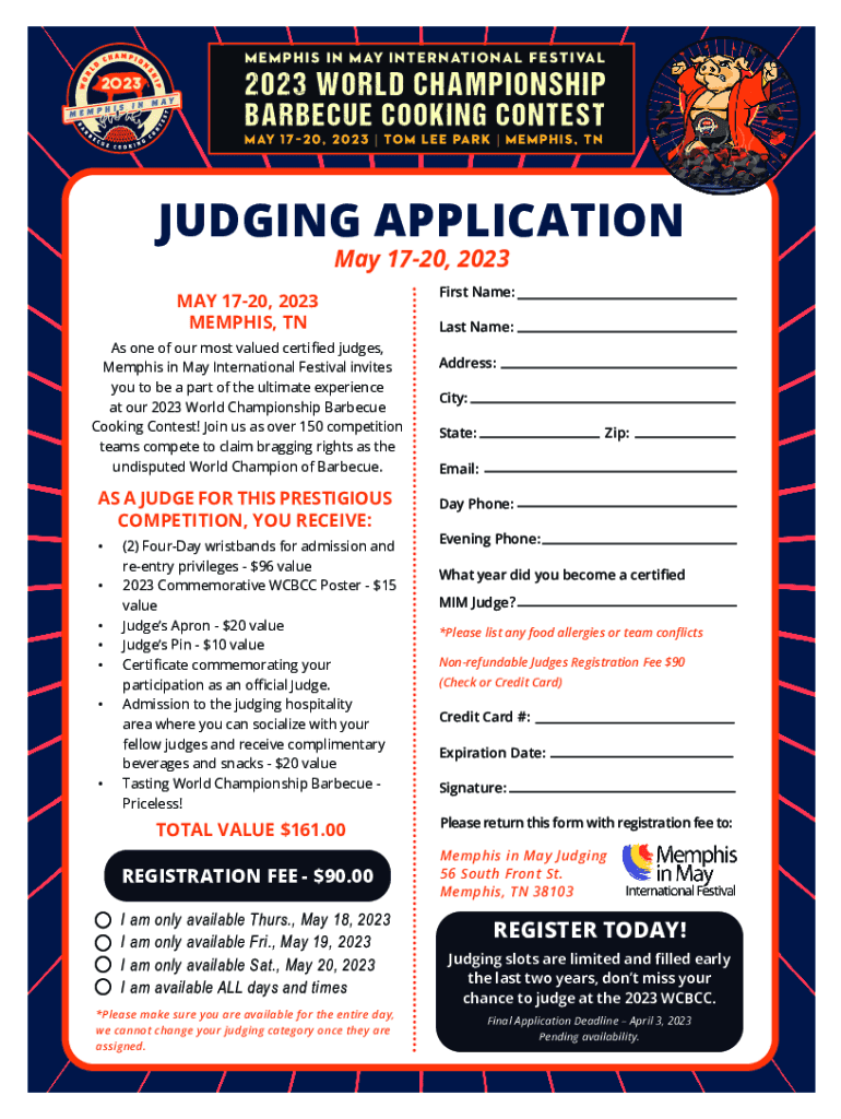 2023JUDGING APPLICATION May 1720, 2023MAY 1720, 2023 MEMPHIS, TN As one of our most valued certified judges, Memphis in May International Festival invites you to be a part of the ultimate experience