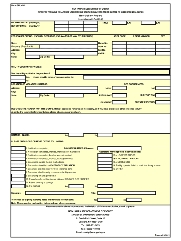 Form SNU0401 NEW HAMPSHIRE DEPARTMENT OF ENERGY REPORT OF PROBABLE VIOLATION OF UNDERGROUND UTILITY REGULATIONS AND/OR DAMAGE TO UNDERGROUND FACILITIESNonUtility Report (In compliance with PUC 805.05)