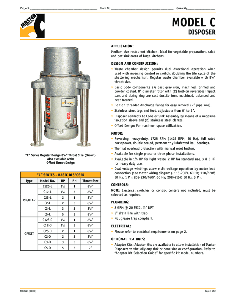 Project:___Item No.___Quantity___MODEL C DISPOSERAPPLICATION: Medium size restaurant kitchen. Ideal for vegetable preparation, salad and pot sink areas of large kitchens.DESIGN AND CONSTRUCTION: Waste