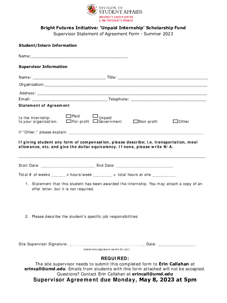 Bright Futures Initiative: \'Unpaid Internship\' Scholarship Fund Supervisor Statement of Agreement Form Summer 2023 Student/Intern Information Name:___ Supervisor Information Name: ___ Title: ___