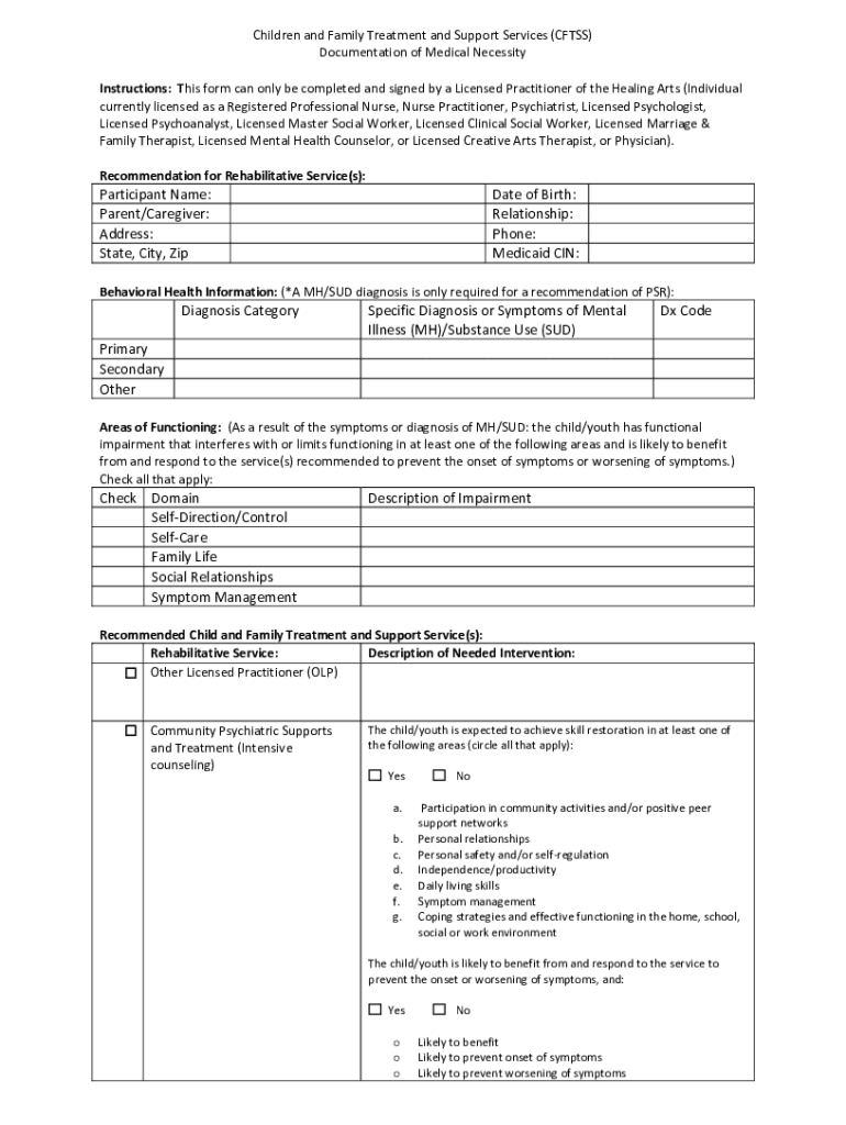 Children and Family Treatment and Support Services (CF TSS) Documentation of Medical Necessity Instructions: This form can only be completed and signed by a Licensed Practitioner of the Healing Arts