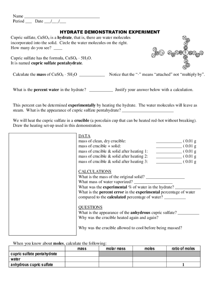 Name ___ Period ___ Date ___/___/___ HYDRATE DEMONSTRATION EXPERIMENT Cupric sulfate, CuSO4 is a hydrate, that is, there are water molecules incorporated into the solid. Circle the water molecules