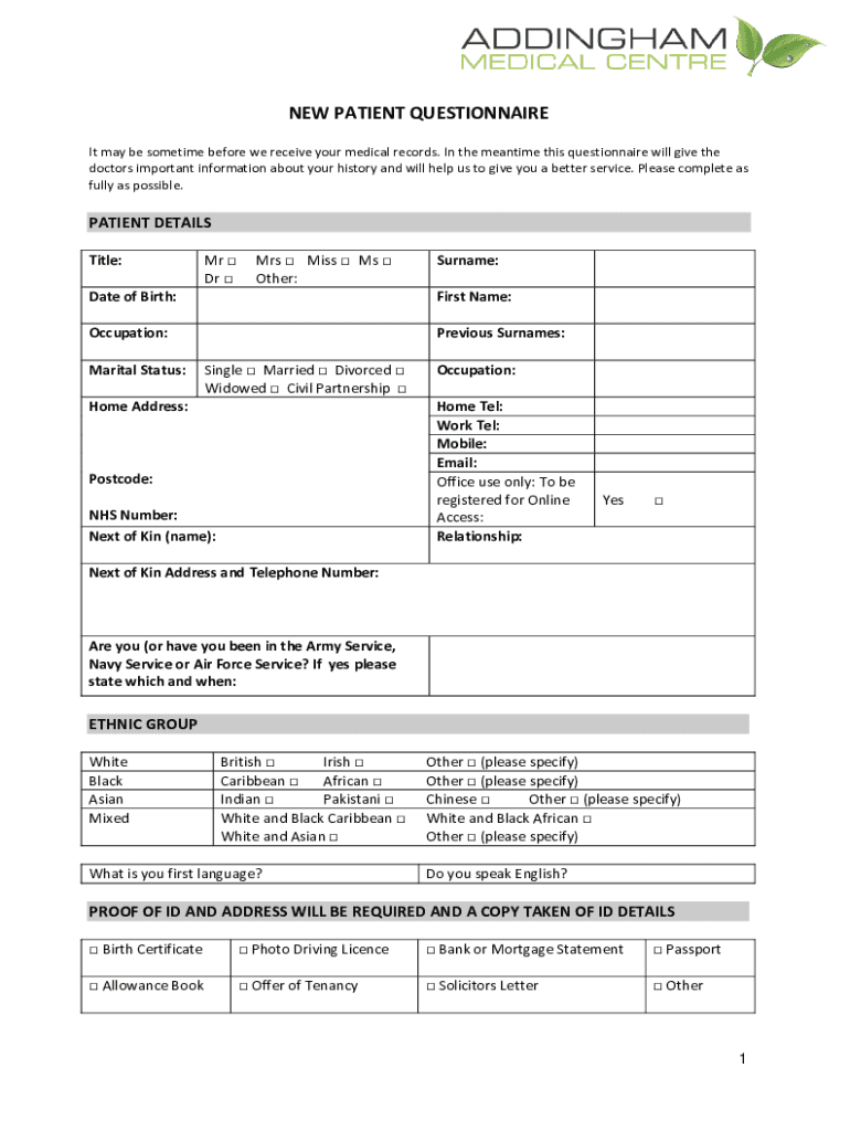 NEW PATIENT QUESTIONNAIRE It may be sometime before we receive your medical records. In the meantime this questionnaire will give the doctors important information about your history and will help