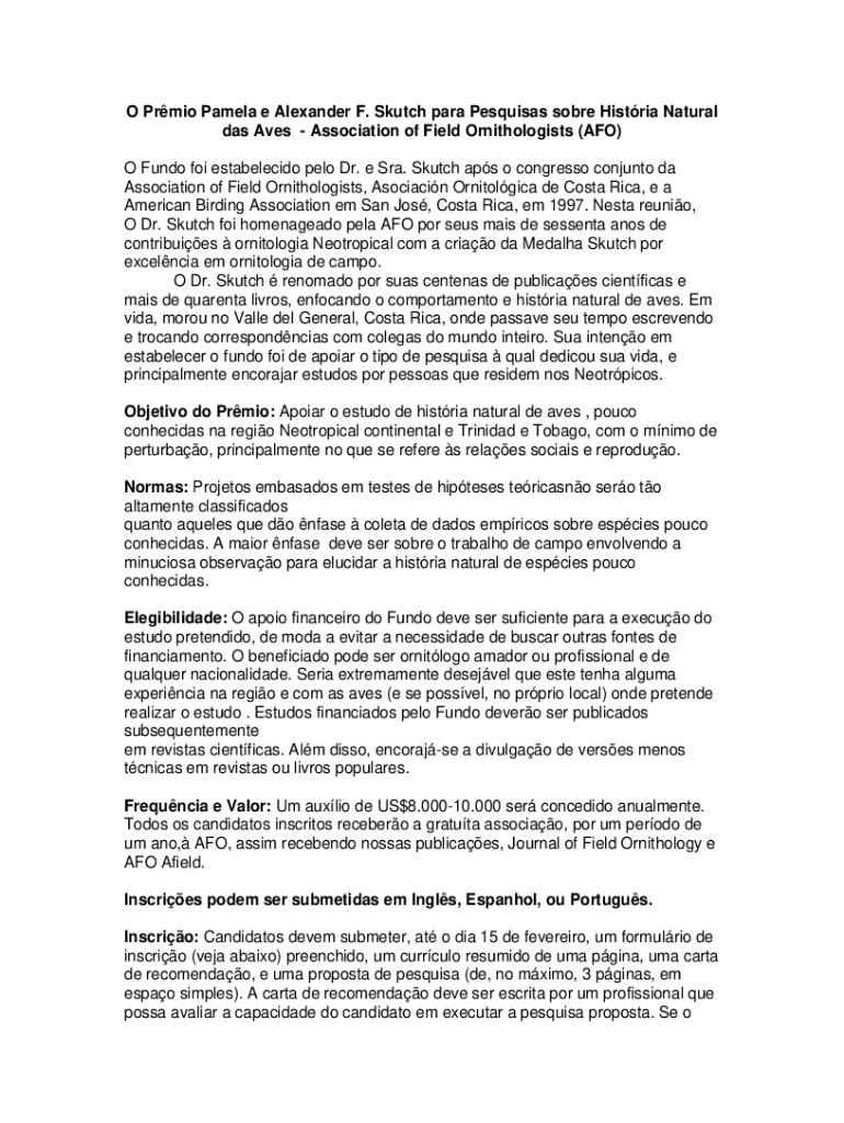 Obtenha o gratuito O Prmio Pamela e Alexander F. Skutch para Pesquisas ...
